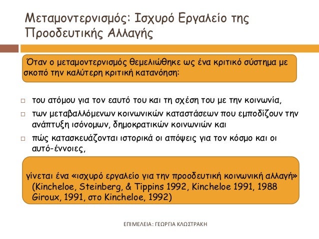 49. 49. Μεηαμμκηενκηζμυξ: Ιζπονυ Γνγαιείμ ηεξΠνμμδεοηηθήξ ΑιιαγήξΌηακ μ μεηαμμκηενκηζμυξ ζεμειηχζεθε ςξ έκα θνηηηθυ ζφζηεμα μεζθμπυ ηεκ θαιφηενε θνηηηθή θαηακυεζε: ημο αηυμμο γηα ημκ εαοηυ ημο θαη ηε ζπέζε ημο με ηεκ θμηκςκία, ηςκ μεηαβαιιυμεκςκ θμηκςκηθχκ θαηαζηάζεςκ πμο εμπμδίδμοκ ηεκακάπηολε ηζυκμμςκ, δεμμθναηηθχκ θμηκςκηχκ θαη πχξ θαηαζθεοάδμκηαη ηζημνηθά μη απυρεηξ γηα ημκ θυζμμ θαη μηαοηυ-έκκμηεξ,γίκεηαη έκα «ηζπονυ ενγαιείμ γηα ηεκ πνμμδεοηηθή θμηκςκηθή αιιαγή»(Kincheloe, Steinberg, & Tippins 1992, Kincheloe 1991, 1988Giroux, 1991, ζημ Kincheloe, 1992)ΕΠΙΜΕΛΕΙΑ: ΓΕΩΡΓΙΑ ΚΛΩ΢ΣΡΑΚΗ