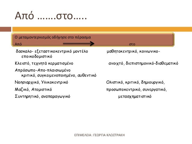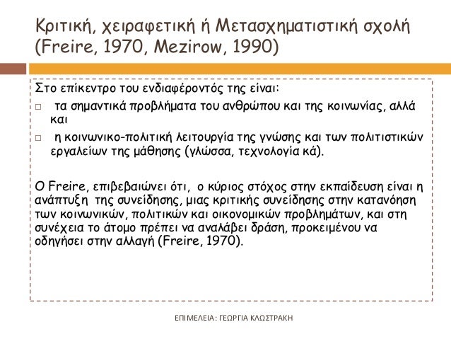 85. 85. Κνηηηθή, πεηναθεηηθή ή Μεηαζπεμαηηζηηθή ζπμιή(Freire, 1970, Mezirow, 1990)΢ημ επίθεκηνμ ημο εκδηαθένμκηυξ ηεξ είκαη: ηα ζεμακηηθά πνμβιήμαηα ημο ακζνχπμο θαη ηεξ θμηκςκίαξ, αιιάθαη ε θμηκςκηθμ-πμιηηηθή ιεηημονγία ηεξ γκχζεξ θαη ηςκ πμιηηηζηηθχκενγαιείςκ ηεξ μάζεζεξ (γιχζζα, ηεπκμιμγία θά).Ο Freire, επηβεβαηχκεη υηη, μ θφνημξ ζηυπμξ ζηεκ εθπαίδεοζε είκαη εακάπηολε ηεξ ζοκείδεζεξ, μηαξ θνηηηθήξ ζοκείδεζεξ ζηεκ θαηακυεζεηςκ θμηκςκηθχκ, πμιηηηθχκ θαη μηθμκμμηθχκ πνμβιεμάηςκ, θαη ζηεζοκέπεηα ημ άημμμ πνέπεη κα ακαιάβεη δνάζε, πνμθεημέκμο καμδεγήζεη ζηεκ αιιαγή (Freire, 1970).ΕΠΙΜΕΛΕΙΑ: ΓΕΩΡΓΙΑ ΚΛΩ΢ΣΡΑΚΗ