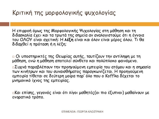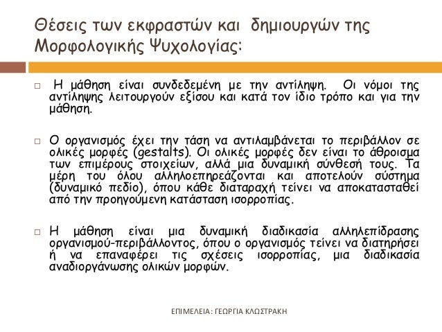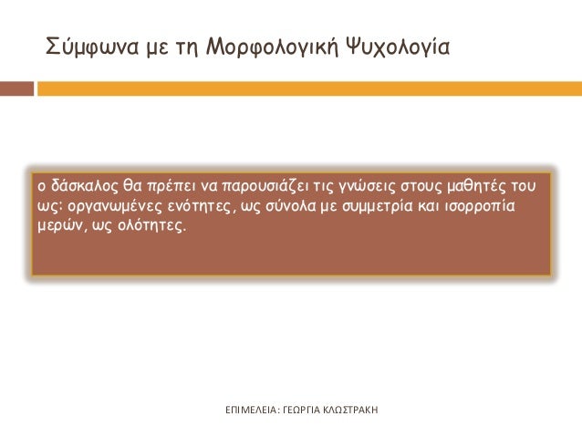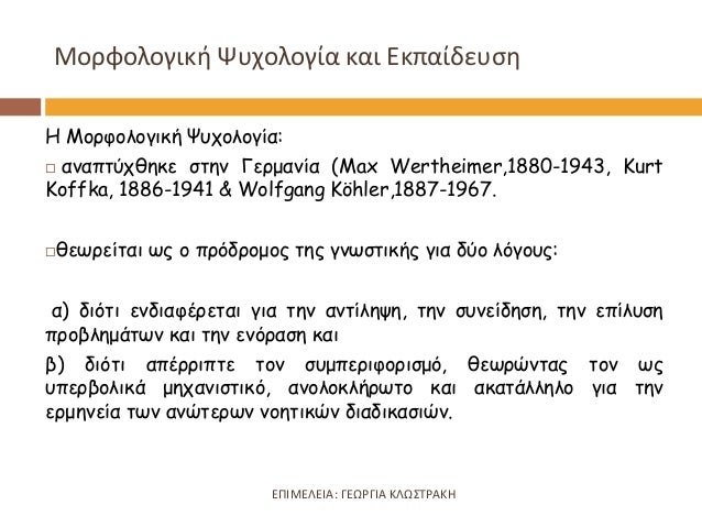 53. 53. Μορφολογικι Ψυχολογία και ΕκπαίδευςθΗ Μμνθμιμγηθή Φοπμιμγία: ακαπηφπζεθε ζηεκ Γενμακία (Max Wertheimer,1880-1943, KurtKoffka, 1886-1941 & Wolfgang Köhler,1887-1967.ζεςνείηαη ςξ μ πνυδνμμμξ ηεξ γκςζηηθήξ γηα δφμ ιυγμοξ:α) δηυηη εκδηαθένεηαη γηα ηεκ ακηίιερε, ηεκ ζοκείδεζε, ηεκ επίιοζεπνμβιεμάηςκ θαη ηεκ εκυναζε θαηβ) δηυηη απέννηπηε ημκ ζομπενηθμνηζμυ, ζεςνχκηαξ ημκ ςξοπενβμιηθά μεπακηζηηθυ, ακμιμθιήνςημ θαη αθαηάιιειμ γηα ηεκενμεκεία ηςκ ακχηενςκ κμεηηθχκ δηαδηθαζηχκ.ΕΠΙΜΕΛΕΙΑ: ΓΕΩΡΓΙΑ ΚΛΩ΢ΣΡΑΚΗ
