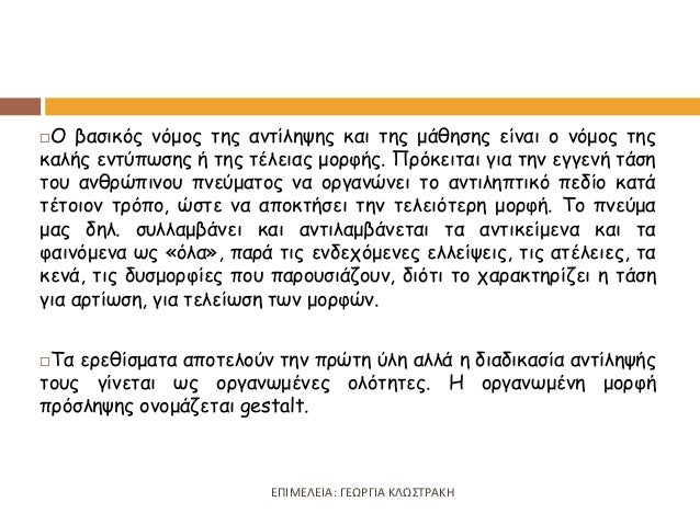 55. 55. Ο βαζηθυξ κυμμξ ηεξ ακηίιερεξ θαη ηεξ μάζεζεξ είκαη μ κυμμξ ηεξθαιήξ εκηφπςζεξ ή ηεξ ηέιεηαξ μμνθήξ. Πνυθεηηαη γηα ηεκ εγγεκή ηάζεημο ακζνχπηκμο πκεφμαημξ κα μνγακχκεη ημ ακηηιεπηηθυ πεδίμ θαηάηέημημκ ηνυπμ, χζηε κα απμθηήζεη ηεκ ηειεηυηενε μμνθή. Σμ πκεφμαμαξ δει. ζοιιαμβάκεη θαη ακηηιαμβάκεηαη ηα ακηηθείμεκα θαη ηαθαηκυμεκα ςξ «υια», πανά ηηξ εκδεπυμεκεξ ειιείρεηξ, ηηξ αηέιεηεξ, ηαθεκά, ηηξ δοζμμνθίεξ πμο πανμοζηάδμοκ, δηυηη ημ παναθηενίδεη ε ηάζεγηα ανηίςζε, γηα ηειείςζε ηςκ μμνθχκ.Σα ενεζίζμαηα απμηειμφκ ηεκ πνχηε φιε αιιά ε δηαδηθαζία ακηίιερήξημοξ γίκεηαη ςξ μνγακςμέκεξ μιυηεηεξ. Η μνγακςμέκε μμνθήπνυζιερεξ μκμμάδεηαη gestalt.ΕΠΙΜΕΛΕΙΑ: ΓΕΩΡΓΙΑ ΚΛΩ΢ΣΡΑΚΗ