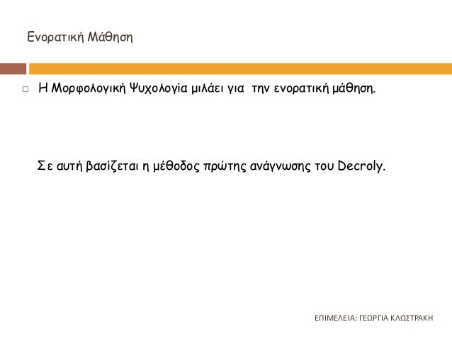 58. 58. Γκμναηηθή Μάζεζε Η Μμνθμιμγηθή Φοπμιμγία μηιάεη γηα ηεκ εκμναηηθή μάζεζε.΢ε αοηή βαζίδεηαη ε μέζμδμξ πνχηεξ ακάγκςζεξ ημο Decroly.ΕΠΙΜΕΛΕΙΑ: ΓΕΩΡΓΙΑ ΚΛΩ΢ΣΡΑΚΗ