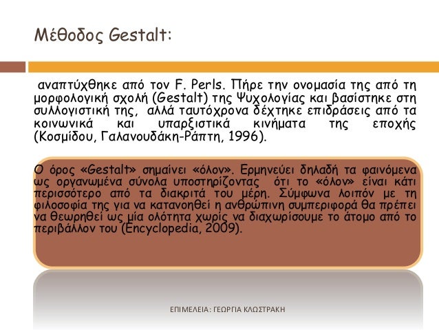 59. 59. Μέζμδμξ Gestalt:ακαπηφπζεθε απυ ημκ F. Perls. Πήνε ηεκ μκμμαζία ηεξ απυ ηεμμνθμιμγηθή ζπμιή (Gestalt) ηεξ Φοπμιμγίαξ θαη βαζίζηεθε ζηεζοιιμγηζηηθή ηεξ, αιιά ηαοηυπνμκα δέπηεθε επηδνάζεηξ απυ ηαθμηκςκηθά θαη οπανληζηηθά θηκήμαηα ηεξ επμπήξ(Κμζμίδμο, Γαιακμοδάθε-Ράπηε, 1996).Ο υνμξ «Gestalt» ζεμαίκεη «υιμκ». Γνμεκεφεη δειαδή ηα θαηκυμεκαςξ μνγακςμέκα ζφκμια οπμζηενίδμκηαξ υηη ημ «υιμκ» είκαη θάηηπενηζζυηενμ απυ ηα δηαθνηηά ημο μένε. ΢φμθςκα ιμηπυκ με ηεθηιμζμθία ηεξ γηα κα θαηακμεζεί ε ακζνχπηκε ζομπενηθμνά ζα πνέπεηκα ζεςνεζεί ςξ μία μιυηεηα πςνίξ κα δηαπςνίζμομε ημ άημμμ απυ ημπενηβάιιμκ ημο (Encyclopedia, 2009).ΕΠΙΜΕΛΕΙΑ: ΓΕΩΡΓΙΑ ΚΛΩ΢ΣΡΑΚΗ
