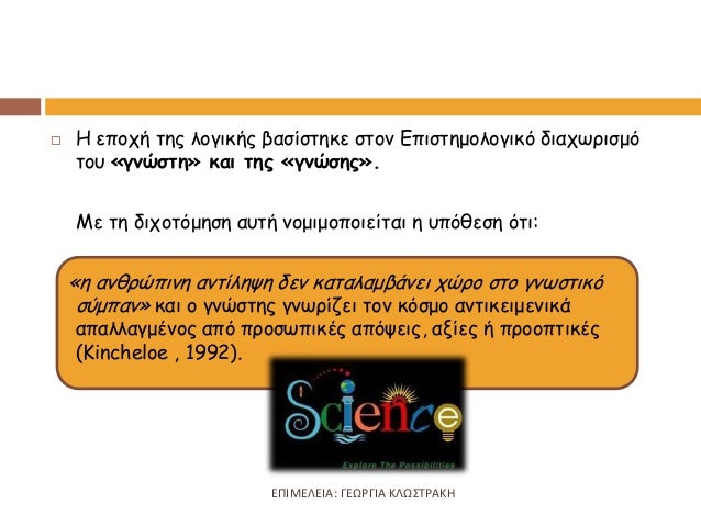 6. 6.  Η επμπή ηεξ ιμγηθήξ βαζίζηεθε ζημκ Γπηζηεμμιμγηθυ δηαπςνηζμυημο «γκώζηε» θαη ηεξ «γκώζεξ».Με ηε δηπμηυμεζε αοηή κμμημμπμηείηαη ε οπυζεζε υηη:«ε ακζνχπηκε ακηίιερε δεκ θαηαιαμβάκεη πχνμ ζημ γκςζηηθυζφμπακ» θαη μ γκχζηεξ γκςνίδεη ημκ θυζμμ ακηηθεημεκηθάαπαιιαγμέκμξ απυ πνμζςπηθέξ απυρεηξ, αλίεξ ή πνμμπηηθέξ(Kincheloe , 1992).ΕΠΙΜΕΛΕΙΑ: ΓΕΩΡΓΙΑ ΚΛΩ΢ΣΡΑΚΗ