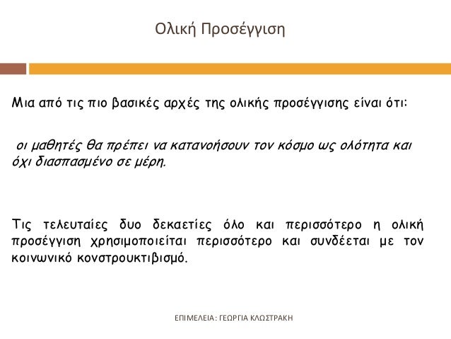 65. 65. Ολικι ΠροςζγγιςθΜηα απυ ηηξ πημ βαζηθέξ ανπέξ ηεξ μιηθήξ πνμζέγγηζεξ είκαη υηη:μη μαζεηέξ ζα πνέπεη κα θαηακμήζμοκ ημκ θυζμμ ςξ μιυηεηα θαηυπη δηαζπαζμέκμ ζε μένε.Σηξ ηειεοηαίεξ δομ δεθαεηίεξ υιμ θαη πενηζζυηενμ ε μιηθήπνμζέγγηζε πνεζημμπμηείηαη πενηζζυηενμ θαη ζοκδέεηαη με ημκθμηκςκηθυ θμκζηνμοθηηβηζμυ.ΕΠΙΜΕΛΕΙΑ: ΓΕΩΡΓΙΑ ΚΛΩ΢ΣΡΑΚΗ