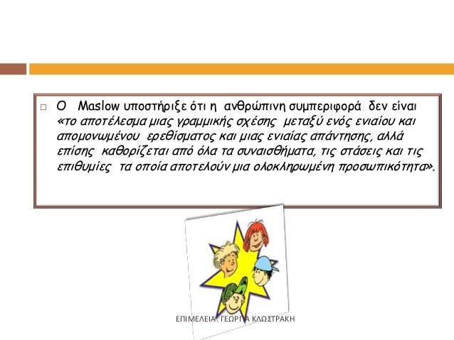 69. 69.  Ο Maslow οπμζηήνηλε υηη ε ακζνχπηκε ζομπενηθμνά δεκ είκαη«ημ απμηέιεζμα μηαξ γναμμηθήξ ζπέζεξ μεηαλφ εκυξ εκηαίμο θαηαπμμμκςμέκμο ενεζίζμαημξ θαη μηαξ εκηαίαξ απάκηεζεξ, αιιάεπίζεξ θαζμνίδεηαη απυ υια ηα ζοκαηζζήμαηα, ηηξ ζηάζεηξ θαη ηηξεπηζομίεξ ηα μπμία απμηειμφκ μηα μιμθιενςμέκε πνμζςπηθυηεηα».ΕΠΙΜΕΛΕΙΑ: ΓΕΩΡΓΙΑ ΚΛΩ΢ΣΡΑΚΗ
