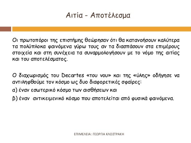 7. 7. Οη πνςημπυνμη ηεξ επηζηήμεξ ζεχνεζακ υηη ζα θαηακμήζμοκ θαιφηεναηα πμιφπιμθα θαηκυμεκα γφνς ημοξ ακ ηα δηαζπάζμοκ ζηα επημένμοξζημηπεία θαη ζηε ζοκέπεηα ηα ζοκανμμιμγήζμοκ με ημ κυμμ ηεξ αηηίαξθαη ημο απμηειέζμαημξ.Ο δηαπςνηζμυξ ημο Decartes «ημο κμο» θαη ηεξ «φιεξ» μδήγεζε καακηηιεθζμφμε ημκ θυζμμ ςξ δομ δηαθμνεηηθέξ ζθαίνεξ:α) έκακ εζςηενηθυ θυζμμ ηςκ αηζζήζεςκ θαηβ) έκακ ακηηθεημεκηθυ θυζμμ πμο απμηειείηαη απυ θοζηθά θαηκυμεκα.Αηηία - ΑπμηέιεζμαΕΠΙΜΕΛΕΙΑ: ΓΕΩΡΓΙΑ ΚΛΩ΢ΣΡΑΚΗ