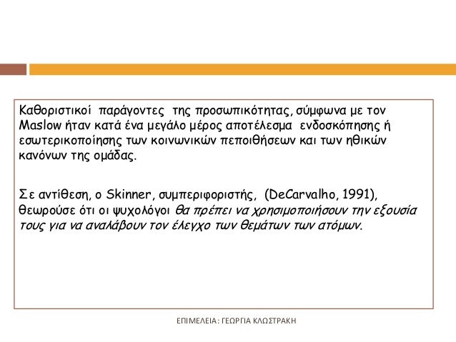 70. 70. Καζμνηζηηθμί πανάγμκηεξ ηεξ πνμζςπηθυηεηαξ, ζφμθςκα με ημκMaslow ήηακ θαηά έκα μεγάιμ μένμξ απμηέιεζμα εκδμζθυπεζεξ ήεζςηενηθμπμίεζεξ ηςκ θμηκςκηθχκ πεπμηζήζεςκ θαη ηςκ εζηθχκθακυκςκ ηεξ μμάδαξ.΢ε ακηίζεζε, μ Skinner, ζομπενηθμνηζηήξ, (DeCarvalho, 1991),ζεςνμφζε υηη μη ροπμιυγμη ζα πνέπεη κα πνεζημμπμηήζμοκ ηεκ ελμοζίαημοξ γηα κα ακαιάβμοκ ημκ έιεγπμ ηςκ ζεμάηςκ ηςκ αηυμςκ.ΕΠΙΜΕΛΕΙΑ: ΓΕΩΡΓΙΑ ΚΛΩ΢ΣΡΑΚΗ