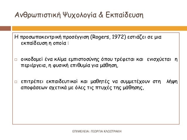 71. 71. Ακζνςπηζηηθή Φοπμιμγία & ΓθπαίδεοζεΗ πνμζςπμθεκηνηθή πνμζέγγηζε (Rogers, 1972) εζηηάδεη ζε μηαεθπαίδεοζε ε μπμία : μηθμδμμεί έκα θιίμα εμπηζημζφκεξ υπμο ηνέθεηαη θαη εκηζπφεηαη επενηένγεηα, ε θοζηθή επηζομία γηα μάζεζε, επηηνέπεη εθπαηδεοηηθμί θαη μαζεηέξ κα ζομμεηέπμοκ ζηε ιήρεαπμθάζεςκ ζπεηηθά με υιεξ ηηξ πηοπέξ ηεξ μάζεζεξ,ΕΠΙΜΕΛΕΙΑ: ΓΕΩΡΓΙΑ ΚΛΩ΢ΣΡΑΚΗ