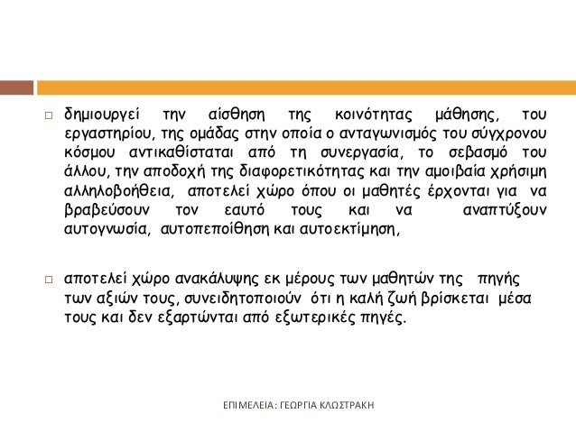 72. 72.  δεμημονγεί ηεκ αίζζεζε ηεξ θμηκυηεηαξ μάζεζεξ, ημοενγαζηενίμο, ηεξ μμάδαξ ζηεκ μπμία μ ακηαγςκηζμυξ ημο ζφγπνμκμοθυζμμο ακηηθαζίζηαηαη απυ ηε ζοκενγαζία, ημ ζεβαζμυ ημοάιιμο, ηεκ απμδμπή ηεξ δηαθμνεηηθυηεηαξ θαη ηεκ αμμηβαία πνήζημεαιιειμβμήζεηα, απμηειεί πχνμ υπμο μη μαζεηέξ ένπμκηαη γηα καβναβεφζμοκ ημκ εαοηυ ημοξ θαη κα ακαπηφλμοκαοημγκςζία, αοημπεπμίζεζε θαη αοημεθηίμεζε, απμηειεί πχνμ ακαθάιορεξ εθ μένμοξ ηςκ μαζεηχκ ηεξ πεγήξηςκ αληχκ ημοξ, ζοκεηδεημπμημφκ υηη ε θαιή δςή βνίζθεηαη μέζαημοξ θαη δεκ ελανηχκηαη απυ ελςηενηθέξ πεγέξ.ΕΠΙΜΕΛΕΙΑ: ΓΕΩΡΓΙΑ ΚΛΩ΢ΣΡΑΚΗ