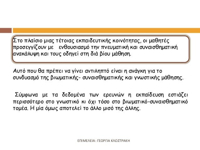 73. 73. ΢ημ πιαίζημ μηαξ ηέημηαξ εθπαηδεοηηθήξ θμηκυηεηαξ, μη μαζεηέξπνμζεγγίδμοκ με εκζμοζηαζμυ ηεκ πκεομαηηθή θαη ζοκαηζζεμαηηθήακαθάιορε θαη ημοξ μδεγεί ζηε δηά βίμο μάζεζε.Αοηυ πμο ζα πνέπεη κα γίκεη ακηηιεπηυ είκαη ε ακάγθε γηα ημζοκδοαζμυ ηεξ βηςμαηηθήξ- ζοκαηζζεμαηηθήξ θαη γκςζηηθήξ μάζεζεξ.΢φμθςκα με ηα δεδμμέκα ηςκ ενεοκχκ ε εθπαίδεοζε εζηηάδεηπενηζζυηενμ ζημ γκςζηηθυ θη υπη ηυζμ ζημ βηςμαηηθυ-ζοκαηζζεμαηηθυημμέα. Η μία υμςξ απμηειεί ημ άιιμ μηζυ ηεξ άιιεξ.ΕΠΙΜΕΛΕΙΑ: ΓΕΩΡΓΙΑ ΚΛΩ΢ΣΡΑΚΗ