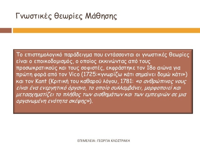 74. 74. Γκςζηηθέξ ζεςνίεξ ΜάζεζεξΣμ επηζηεμμιμγηθυ πανάδεηγμα πμο εκηάζζμκηαη μη γκςζηηθέξ ζεςνίεξείκαη μ επμηθμδμμηζμυξ, μ μπμίμξ εθθηκχκηαξ απυ ημοξπνμζςθναηηθμφξ θαη ημοξ ζμθηζηέξ, εθθνάζηεθε ημκ 18μ αηχκα γηαπνχηε θμνά απυ ημκ Vico (1725:«γκςνίδς θάηη ζεμαίκεη δμμχ θάηη»)θαη ημκ Kant (Κνηηηθή ημο θαζανμφ ιυγμο, 1781: «μ ακζνχπηκμξ κμοξείκαη έκα εκενγεηηθυ υνγακμ, ημ μπμίμ ζοιιαμβάκεη, μμνθμπμηεί θαημεηαζπεμαηίδεη ημ πιήζμξ ηςκ αηζζεμάηςκ θαη ηςκ εμπεηνηχκ ζε μηαμνγακςμέκε εκυηεηα ζθέρεξ»).ΕΠΙΜΕΛΕΙΑ: ΓΕΩΡΓΙΑ ΚΛΩ΢ΣΡΑΚΗ
