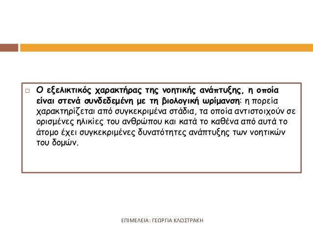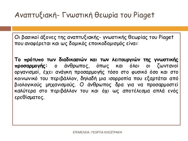 75. 75. Ακαπηοληαθή- Γκςζηηθή ζεςνία ημο PiagetΟη βαζηθμί άλμκεξ ηεξ ακαπηοληαθήξ- γκςζηηθήξ ζεςνίαξ ημο Piagetπμο ακαθένεηαη θαη ςξ δμμηθυξ επμηθμδμμηζμυξ είκαη:Τμ πνόηοπμ ηωκ δηαδηθαζηώκ θαη ηωκ ιεηημονγηώκ ηεξ γκωζηηθήξπνμζανμμγήξ: μ άκζνςπμξ, υπςξ θαη υιμη μη δςκηακμίμνγακηζμμί, έπεη ακάγθε πνμζανμμγήξ ηυζμ ζημ θοζηθυ υζμ θαη ζημθμηκςκηθυ ημο πενηβάιιμκ, δειαδή μηα ηζμννμπία πμο ελανηάηαη απυβημιμγηθμφξ μεπακηζμμφξ. Ο άκζνςπμξ δνα γηα κα πνμζανμμζηείθαιφηενα ζημ πενηβάιιμκ ημο θαη υπη ςξ απμηέιεζμα απιά εκυξενεζίζμαημξ.ΕΠΙΜΕΛΕΙΑ: ΓΕΩΡΓΙΑ ΚΛΩ΢ΣΡΑΚΗ