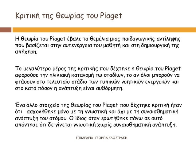 78. 78. Κνηηηθή ηεξ ζεςνίαξ ημο PiagetΗ ζεςνία ημο Piaget έβαιε ηα ζεμέιηα μηαξ παηδαγςγηθήξ ακηίιερεξπμο βαζίδεηαη ζηεκ αοηεκένγεηα ημο μαζεηή θαη ζηε δεμημονγηθή ηεξαπήπεζε.Σμ μεγαιφηενμ μένμξ ηεξ θνηηηθήξ πμο δέπηεθε ε ζεςνία ημο Piagetαθμνμφζε ηεκ ειηθηαθή θαηακμμή ης ζηαδίςκ, ημ ακ υιμη μπμνμφκ καθηάζμοκ ζημ ηειεοηαίμ ζηάδημ ηςκ ηοπηθχκ κμεηηθχκ εκενγεηχκ θαηζημ θαηά πυζμκ ε ακάπηολε είκαη αοζυνμεηε.Έκα άιιμ ζημηπείμ ηεξ ζεςνίαξ ημο Piaget πμο δέπηεθε θνηηηθή ήηακυηη αζπμιήζεθε μυκμ με ηε γκςζηηθή θαη υπη με ηε ζοκαηζζεμαηηθήακάπηολε ημο αηυμμο. Ο ίδημξ υηακ ενςηήζεθε πάκς ζε αοηυαπάκηεζε υηη δε γίκεηαη γκςζηηθή πςνίξ ζοκαηζζεμαηηθή ακάπηολε.ΕΠΙΜΕΛΕΙΑ: ΓΕΩΡΓΙΑ ΚΛΩ΢ΣΡΑΚΗ
