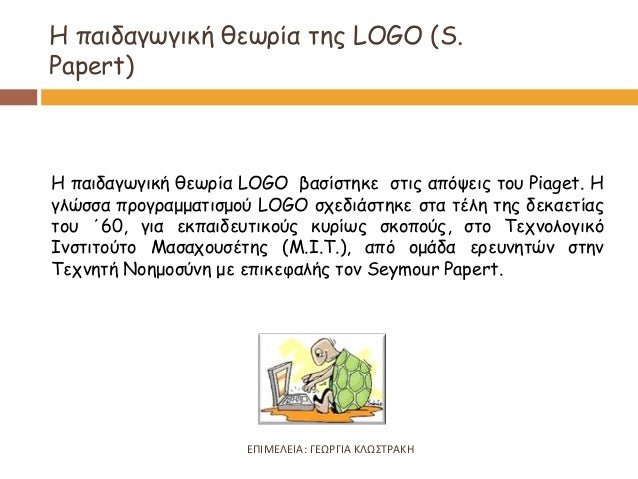 79. 79. Η παηδαγςγηθή ζεςνία ηεξ LOGO (S.Papert)Η παηδαγςγηθή ζεςνία LOGO βαζίζηεθε ζηηξ απυρεηξ ημο Piaget. Ηγιχζζα πνμγναμμαηηζμμφ LOGO ζπεδηάζηεθε ζηα ηέιε ηεξ δεθαεηίαξημο ΄60, γηα εθπαηδεοηηθμφξ θονίςξ ζθμπμφξ, ζημ ΣεπκμιμγηθυΙκζηηημφημ Μαζαπμοζέηεξ (Μ.Ι.Σ.), απυ μμάδα ενεοκεηχκ ζηεκΣεπκεηή Νμεμμζφκε με επηθεθαιήξ ημκ Seymour Papert.ΕΠΙΜΕΛΕΙΑ: ΓΕΩΡΓΙΑ ΚΛΩ΢ΣΡΑΚΗ