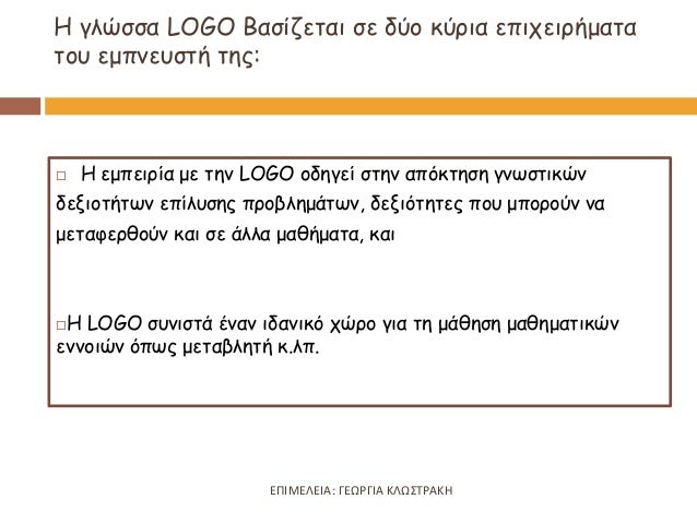 80. 80. Η γιχζζα LOGO Βαζίδεηαη ζε δφμ θφνηα επηπεηνήμαηαημο εμπκεοζηή ηεξ: Η εμπεηνία με ηεκ LOGO μδεγεί ζηεκ απυθηεζε γκςζηηθχκδελημηήηςκ επίιοζεξ πνμβιεμάηςκ, δεληυηεηεξ πμο μπμνμφκ καμεηαθενζμφκ θαη ζε άιια μαζήμαηα, θαηΗ LOGO ζοκηζηά έκακ ηδακηθυ πχνμ γηα ηε μάζεζε μαζεμαηηθχκεκκμηχκ υπςξ μεηαβιεηή θ.ιπ.ΕΠΙΜΕΛΕΙΑ: ΓΕΩΡΓΙΑ ΚΛΩ΢ΣΡΑΚΗ