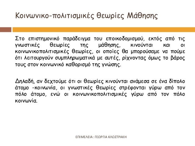 83. 83. Κοινωνικόσ εποικοδομιςμόσ(Vygotsky)Η μάζεζε είκαη:Πνμσυκ θμηκςκηθήξ/ζεμεημιμγηθήξ αιιειεπίδναζεξΣμ θμηκςκηθμ-πμιηηηζηηθυ πιαίζημ είκαη θαζμνηζηηθυ αθμφ πανέπεη:Γνγαιεία ζθέρεξ θίκεηνα ζεμαζίεξΠ.π γιχζζα, ΣΠΓ εκδμγεκή, ελςγεκήυνμοξ νυιμοξ, ηαοηυηεηαζομθναδυμεκα δηαμεζμιαβήζεηξΕΠΙΜΕΛΕΙΑ: ΓΕΩΡΓΙΑ ΚΛΩ΢ΣΡΑΚΗ