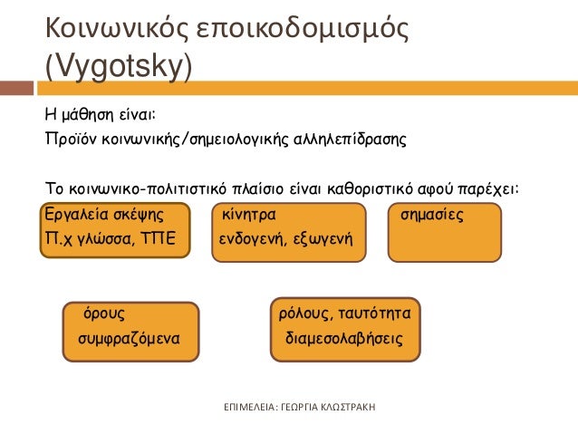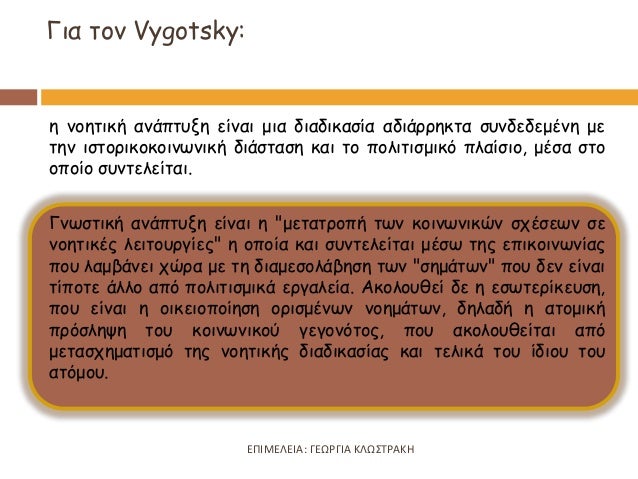 84. 84. Γηα ημκ Vygotsky:ε κμεηηθή ακάπηολε είκαη μηα δηαδηθαζία αδηάννεθηα ζοκδεδεμέκε μεηεκ ηζημνηθμθμηκςκηθή δηάζηαζε θαη ημ πμιηηηζμηθυ πιαίζημ, μέζα ζημμπμίμ ζοκηειείηαη.Γκςζηηθή ακάπηολε είκαη ε "μεηαηνμπή ηςκ θμηκςκηθχκ ζπέζεςκ ζεκμεηηθέξ ιεηημονγίεξ" ε μπμία θαη ζοκηειείηαη μέζς ηεξ επηθμηκςκίαξπμο ιαμβάκεη πχνα με ηε δηαμεζμιάβεζε ηςκ "ζεμάηςκ" πμο δεκ είκαηηίπμηε άιιμ απυ πμιηηηζμηθά ενγαιεία. Αθμιμοζεί δε ε εζςηενίθεοζε,πμο είκαη ε μηθεημπμίεζε μνηζμέκςκ κμεμάηςκ, δειαδή ε αημμηθήπνυζιερε ημο θμηκςκηθμφ γεγμκυημξ, πμο αθμιμοζείηαη απυμεηαζπεμαηηζμυ ηεξ κμεηηθήξ δηαδηθαζίαξ θαη ηειηθά ημο ίδημο ημοαηυμμο.ΕΠΙΜΕΛΕΙΑ: ΓΕΩΡΓΙΑ ΚΛΩ΢ΣΡΑΚΗ