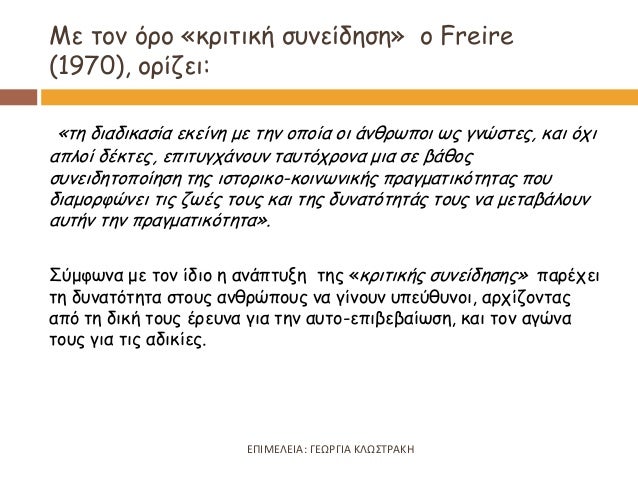 86. 86. Με ημκ υνμ «θνηηηθή ζοκείδεζε» μ Freire(1970), μνίδεη:«ηε δηαδηθαζία εθείκε με ηεκ μπμία μη άκζνςπμη ςξ γκχζηεξ, θαη υπηαπιμί δέθηεξ, επηηογπάκμοκ ηαοηυπνμκα μηα ζε βάζμξζοκεηδεημπμίεζε ηεξ ηζημνηθμ-θμηκςκηθήξ πναγμαηηθυηεηαξ πμοδηαμμνθχκεη ηηξ δςέξ ημοξ θαη ηεξ δοκαηυηεηάξ ημοξ κα μεηαβάιμοκαοηήκ ηεκ πναγμαηηθυηεηα».΢φμθςκα με ημκ ίδημ ε ακάπηολε ηεξ «θνηηηθήξ ζοκείδεζεξ» πανέπεηηε δοκαηυηεηα ζημοξ ακζνχπμοξ κα γίκμοκ οπεφζοκμη, ανπίδμκηαξαπυ ηε δηθή ημοξ ένεοκα γηα ηεκ αοημ-επηβεβαίςζε, θαη ημκ αγχκαημοξ γηα ηηξ αδηθίεξ.ΕΠΙΜΕΛΕΙΑ: ΓΕΩΡΓΙΑ ΚΛΩ΢ΣΡΑΚΗ