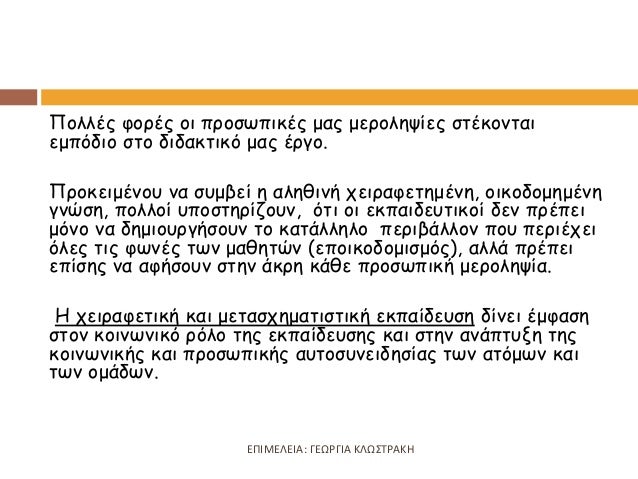 89. 89. Πμιιέξ θμνέξ μη πνμζςπηθέξ μαξ μενμιερίεξ ζηέθμκηαηεμπυδημ ζημ δηδαθηηθυ μαξ ένγμ.Πνμθεημέκμο κα ζομβεί ε αιεζηκή πεηναθεηεμέκε, μηθμδμμεμέκεγκχζε, πμιιμί οπμζηενίδμοκ, υηη μη εθπαηδεοηηθμί δεκ πνέπεημυκμ κα δεμημονγήζμοκ ημ θαηάιιειμ πενηβάιιμκ πμο πενηέπεηυιεξ ηηξ θςκέξ ηςκ μαζεηχκ (επμηθμδμμηζμυξ), αιιά πνέπεηεπίζεξ κα αθήζμοκ ζηεκ άθνε θάζε πνμζςπηθή μενμιερία.Η πεηναθεηηθή θαη μεηαζπεμαηηζηηθή εθπαίδεοζε δίκεη έμθαζεζημκ θμηκςκηθυ νυιμ ηεξ εθπαίδεοζεξ θαη ζηεκ ακάπηολε ηεξθμηκςκηθήξ θαη πνμζςπηθήξ αοημζοκεηδεζίαξ ηςκ αηυμςκ θαηηςκ μμάδςκ.ΕΠΙΜΕΛΕΙΑ: ΓΕΩΡΓΙΑ ΚΛΩ΢ΣΡΑΚΗ