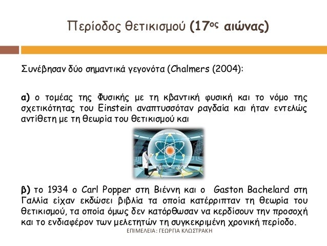 9. 9. ΢οκέβεζακ δφμ ζεμακηηθά γεγμκυηα (Chalmers (2004):α) μ ημμέαξ ηεξ Φοζηθήξ με ηε θβακηηθή θοζηθή θαη ημ κυμμ ηεξζπεηηθυηεηαξ ημο Einstein ακαπηοζζυηακ ναγδαία θαη ήηακ εκηειχξακηίζεηε με ηε ζεςνία ημο ζεηηθηζμμφ θαηβ) ημ 1934 μ Carl Popper ζηε Βηέκκε θαη μ Gaston Bachelard ζηεΓαιιία είπακ εθδχζεη βηβιία ηα μπμία θαηέννηπηακ ηε ζεςνία ημοζεηηθηζμμφ, ηα μπμία υμςξ δεκ θαηυνζςζακ κα θενδίζμοκ ηεκ πνμζμπήθαη ημ εκδηαθένμκ ηςκ μειεηεηχκ ηε ζογθεθνημέκε πνμκηθή πενίμδμ.Πενίμδμξ ζεηηθηζμμφ (17μξ αηώκαξ)ΕΠΙΜΕΛΕΙΑ: ΓΕΩΡΓΙΑ ΚΛΩ΢ΣΡΑΚΗ