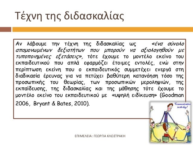 90. 90. Σζχνθ τθσ διδαςκαλίασΑκ ιάβμομε ηεκ ηέπκε ηεξ δηδαζθαιίαξ ςξ «έκα ζφκμιμαπμμμκςμέκςκ δελημηήηςκ πμο μπμνμφκ κα αλημιμγεζμφκ μεηοπμπμηεμέκεξ ελεηάζεηξ», ηυηε έπμομε ημ μμκηέιμ εθείκμ ημοεθπαηδεοηηθμφ πμο απιά εθανμυδεη έημημεξ εκημιέξ, εκχ ζηεκπενίπηςζε εθείκε πμο μ εθπαηδεοηηθυξ ζομμεηέπεη εκενγά ζηεδηαδηθαζία ένεοκαξ γηα κα πεηφπεη βαζφηενε θαηακυεζε ηυζμ ηεξπνμζςπηθήξ ημο ζεςνίαξ, ηςκ πνμζςπηθχκ μενμιερηχκ, ηεξεθπαίδεοζεξ, ηεξ δηδαζθαιίαξ θαη ηεξ μάζεζεξ ηυηε έπμομε ημμμκηέιμ εθείκμ ημο εθπαηδεοηηθμφ με «ορειή εηδίθεοζε» (Goodman2006, Bryant & Bates, 2010).ΕΠΙΜΕΛΕΙΑ: ΓΕΩΡΓΙΑ ΚΛΩ΢ΣΡΑΚΗ