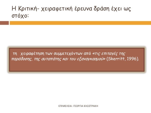 92. 92. Η Κνηηηθή- πεηναθεηηθή ένεοκα δνάζε έπεη ςξζηυπμ:ηε πεηναθέηεζε ηςκ ζομμεηεπυκηςκ απυ «ηηξ επηηαγέξ ηεξπανάδμζεξ, ηεξ αοηαπάηεξ θαη ημο ελακαγθαζμμφ» (Skerritt, 1996).ΕΠΙΜΕΛΕΙΑ: ΓΕΩΡΓΙΑ ΚΛΩ΢ΣΡΑΚΗ