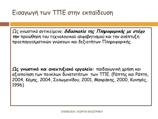 96. 96. Γηζαγςγή ηςκ ΣΠΓ ζηεκ εθπαίδεοζεΩξ γκςζηηθυ ακηηθείμεκμ: δηδαζθαιία ηεξ Πιενμθμνηθήξ με ζηόπμηεκ πνμχζεζε ημο ηεπκμιμγηθμφ αιθαβεηηζμμφ θαη ηεκ ακάπηολεπνμεπαγγειμαηηθχκ γκχζεςκ θαη δελημηήηςκ Πιενμθμνηθήξ.Ωξ γκωζηηθό θαη ακαπηοληαθό ενγαιείμ: παηδαγςγηθή πνήζε θαηαλημπμίεζε ηςκ πμηθίιςκ δοκαημηήηςκ ηςκ ΣΠΓ. (Ράπηεξ θαη Ράπηε,2004, Κυμεξ, 2004, ΢μιςμμκίδμο, 2001, Μαθνάθεξ, 2000, Κοκεγυξ,1996)ΕΠΙΜΕΛΕΙΑ: ΓΕΩΡΓΙΑ ΚΛΩ΢ΣΡΑΚΗ