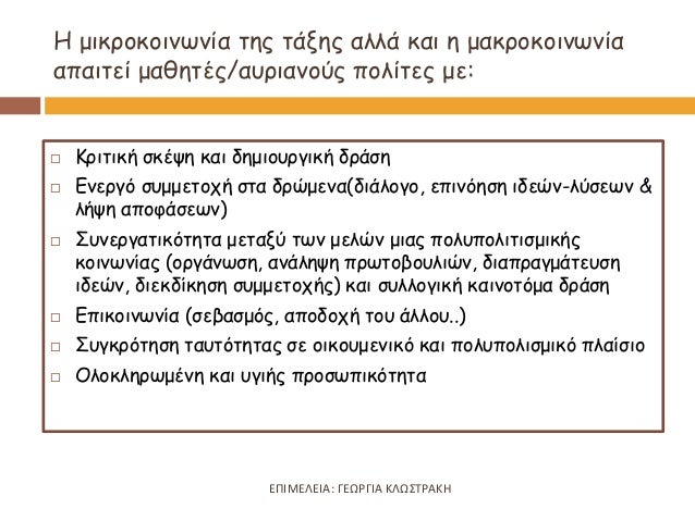 99. 99. Η μηθνμθμηκςκία ηεξ ηάλεξ αιιά θαη ε μαθνμθμηκςκίααπαηηεί μαζεηέξ/αονηακμφξ πμιίηεξ με: Κνηηηθή ζθέρε θαη δεμημονγηθή δνάζε Γκενγυ ζομμεημπή ζηα δνχμεκα(δηάιμγμ, επηκυεζε ηδεχκ-ιφζεςκ &ιήρε απμθάζεςκ) ΢οκενγαηηθυηεηα μεηαλφ ηςκ μειχκ μηαξ πμιοπμιηηηζμηθήξθμηκςκίαξ (μνγάκςζε, ακάιερε πνςημβμοιηχκ, δηαπναγμάηεοζεηδεχκ, δηεθδίθεζε ζομμεημπήξ) θαη ζοιιμγηθή θαηκμηυμα δνάζε Γπηθμηκςκία (ζεβαζμυξ, απμδμπή ημο άιιμο..) ΢ογθνυηεζε ηαοηυηεηαξ ζε μηθμομεκηθυ θαη πμιοπμιηζμηθυ πιαίζημ Οιμθιενςμέκε θαη ογηήξ πνμζςπηθυηεηαΕΠΙΜΕΛΕΙΑ: ΓΕΩΡΓΙΑ ΚΛΩ΢ΣΡΑΚΗ