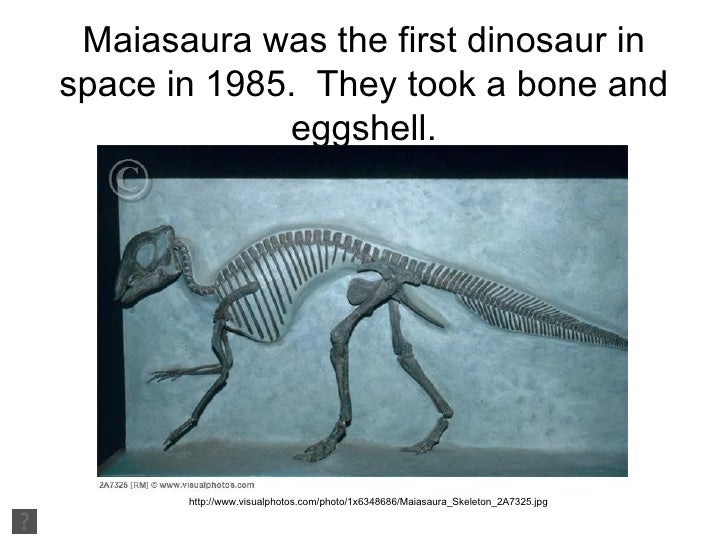 11. 11. Maiasaura was the first dinosaur inspace in 1985. They took a bone and eggshell. http://www.visualphotos.com/photo/1x6348686/Maiasaura_Skeleton_2A7325.jpg
