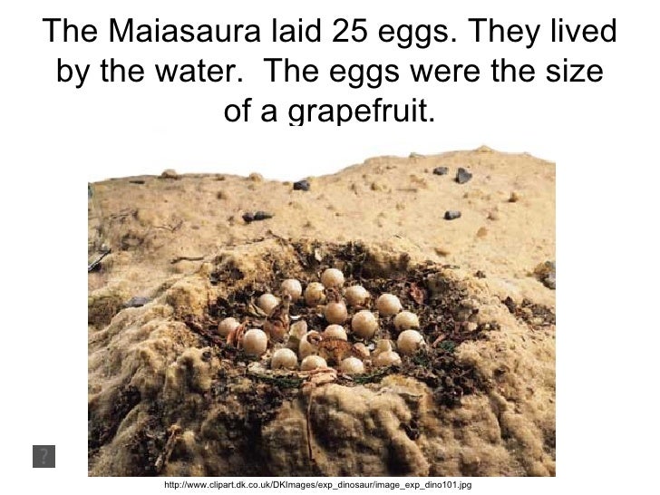 2. 2. The Maiasaura laid 25 eggs. They lived by the water. The eggs were the size of a grapefruit. http://www.clipart.dk.co.uk/DKImages/exp_dinosaur/image_exp_dino101.jpg