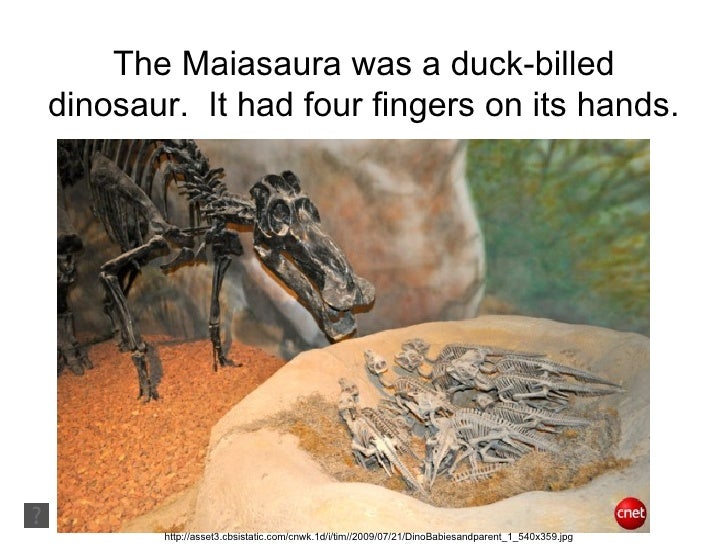5. 5. The Maiasaura was a duck-billeddinosaur. It had four fingers on its hands. http://asset3.cbsistatic.com/cnwk.1d/i/tim//2009/07/21/DinoBabiesandparent_1_540x359.jpg