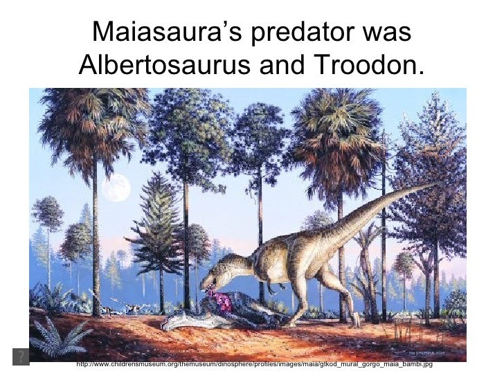 7. 7. Maiasaura’s predator wasAlbertosaurus and Troodon.http://www.childrensmuseum.org/themuseum/dinosphere/profiles/images/maia/gtkod_mural_gorgo_maia_bambi.jpg