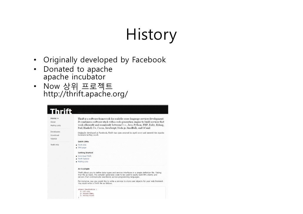 12. 12. History• Originally developed by Facebook• Donated to apache apache incubator• Now 상위 프로젝트 http://thrift.apache.org/