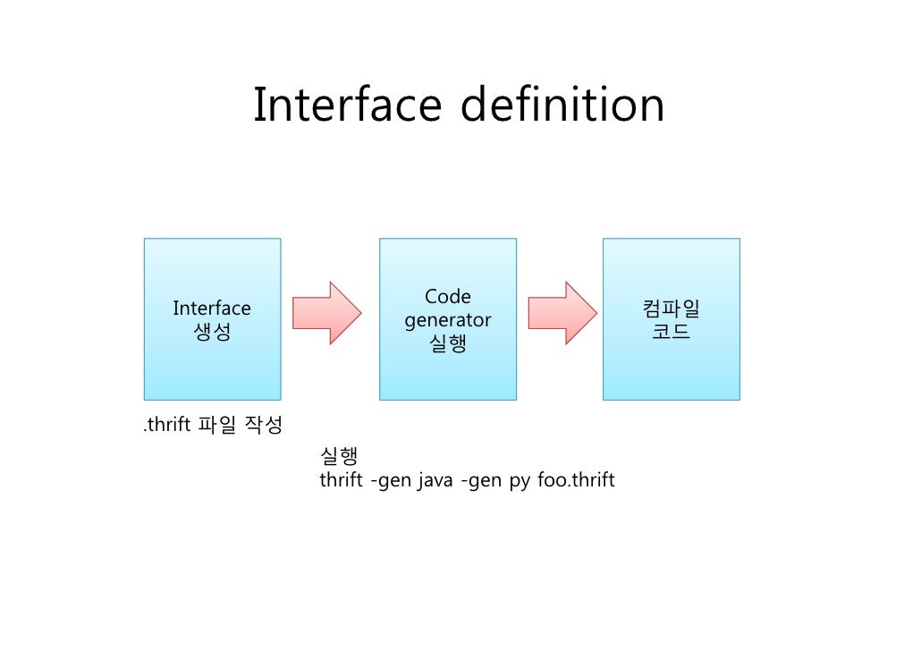 13. 13. Interface definition Code Interface 컴파일 generator 생성 코드 실행.thrift 파일 작성 실행 thrift -gen java -gen py foo.thrift