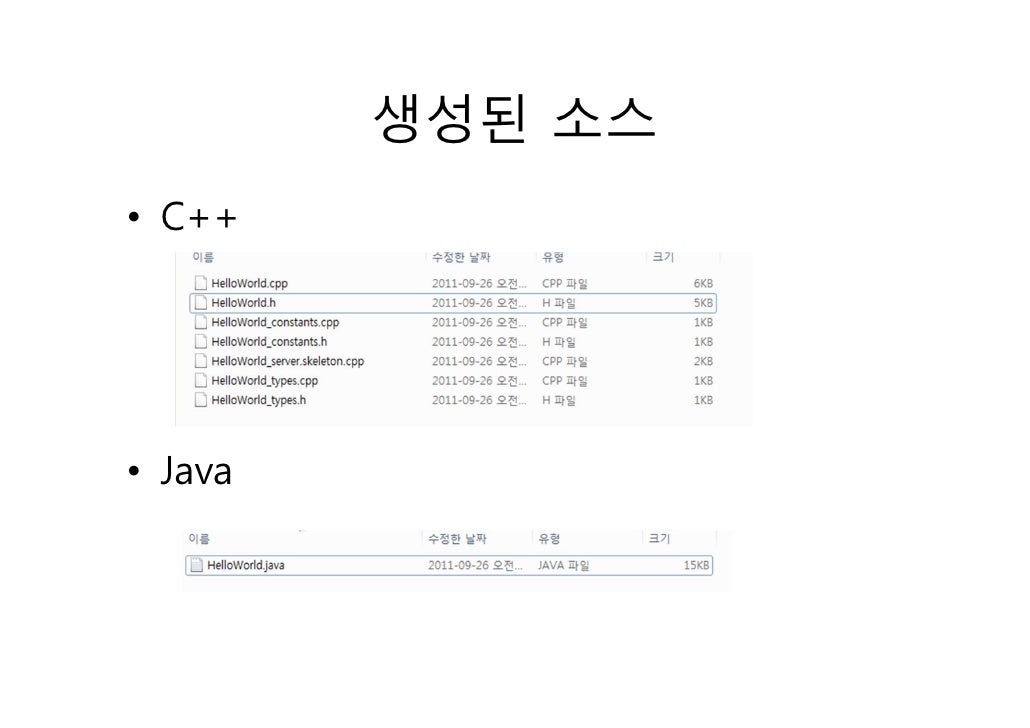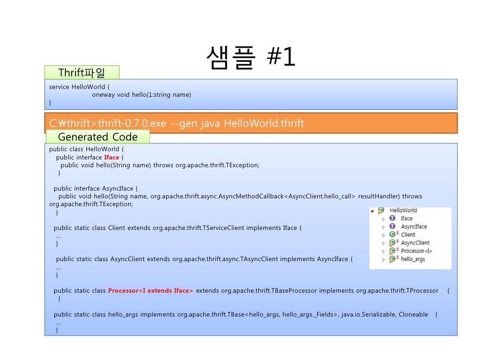 15. 15. Thrift파일 샘플 #1service HelloWorld { oneway void hello(1:string name)}C:thrift>thrift-0.7.0.exe --gen java HelloWorld.thrift Generated Codepublic class HelloWorld { public interface Iface { public void hello(String name) throws org.apache.thrift.TException; } public interface AsyncIface { public void hello(String name, org.apache.thrift.async.AsyncMethodCallback<AsyncClient.hello_call> resultHandler) throwsorg.apache.thrift.TException; } public static class Client extends org.apache.thrift.TServiceClient implements Iface { … } public static class AsyncClient extends org.apache.thrift.async.TAsyncClient implements AsyncIface { … } public static class Processor<I extends Iface> extends org.apache.thrift.TBaseProcessor implements org.apache.thrift.TProcessor { } public static class hello_args implements org.apache.thrift.TBase<hello_args, hello_args._Fields>, java.io.Serializable, Cloneable { … }