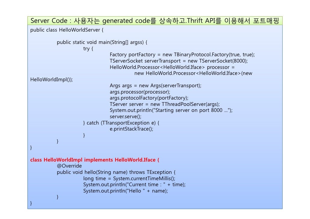 16. 16. Server Code : 사용자는 generated code를 상속하고.Thrift API를 이용해서 포트매핑public class HelloWorldServer { public static void main(String[] argss) { try { Factory portFactory = new TBinaryProtocol.Factory(true, true); TServerSocket serverTransport = new TServerSocket(8000); HelloWorld.Processor<HelloWorld.Iface> processor = new HelloWorld.Processor<HelloWorld.Iface>(newHelloWorldImpl()); Args args = new Args(serverTransport); args.processor(processor); args.protocolFactory(portFactory); TServer server = new TThreadPoolServer(args); System.out.println("Starting server on port 8000 ..."); server.serve(); } catch (TTransportException e) { e.printStackTrace(); } }}class HelloWorldImpl implements HelloWorld.Iface { @Override public void hello(String name) throws TException { long time = System.currentTimeMillis(); System.out.println("Current time : " + time); System.out.println("Hello " + name); }}