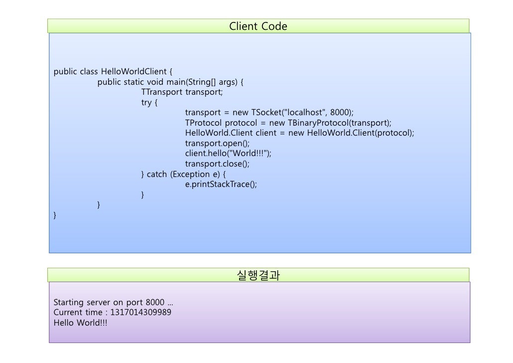 17. 17. Client Codepublic class HelloWorldClient { public static void main(String[] args) { TTransport transport; try { transport = new TSocket("localhost", 8000); TProtocol protocol = new TBinaryProtocol(transport); HelloWorld.Client client = new HelloWorld.Client(protocol); transport.open(); client.hello("World!!!"); transport.close(); } catch (Exception e) { e.printStackTrace(); } }} 실행결과Starting server on port 8000 ...Current time : 1317014309989Hello World!!!