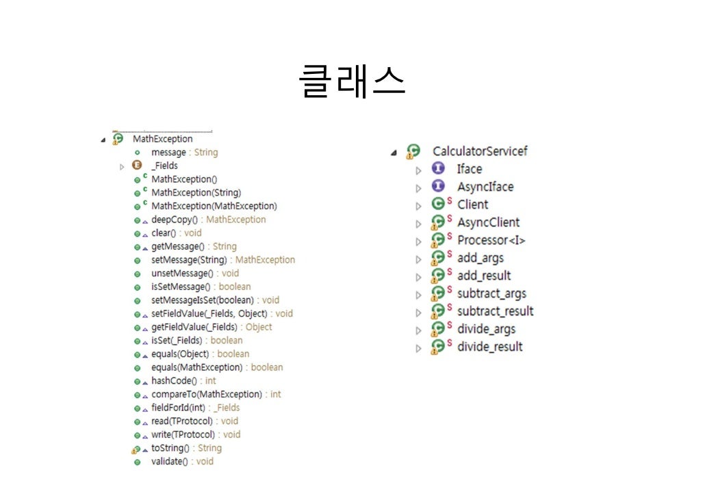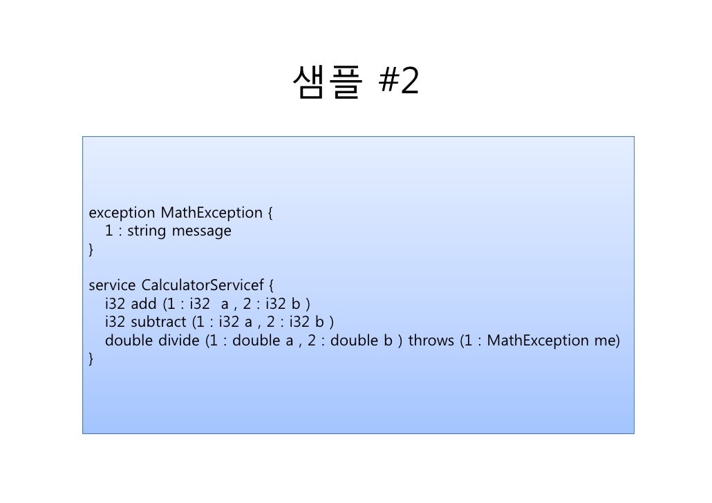 20. 20. 샘플 #2exception MathException { 1 : string message}service CalculatorServicef { i32 add (1 : i32 a , 2 : i32 b ) i32 subtract (1 : i32 a , 2 : i32 b ) double divide (1 : double a , 2 : double b ) throws (1 : MathException me)}