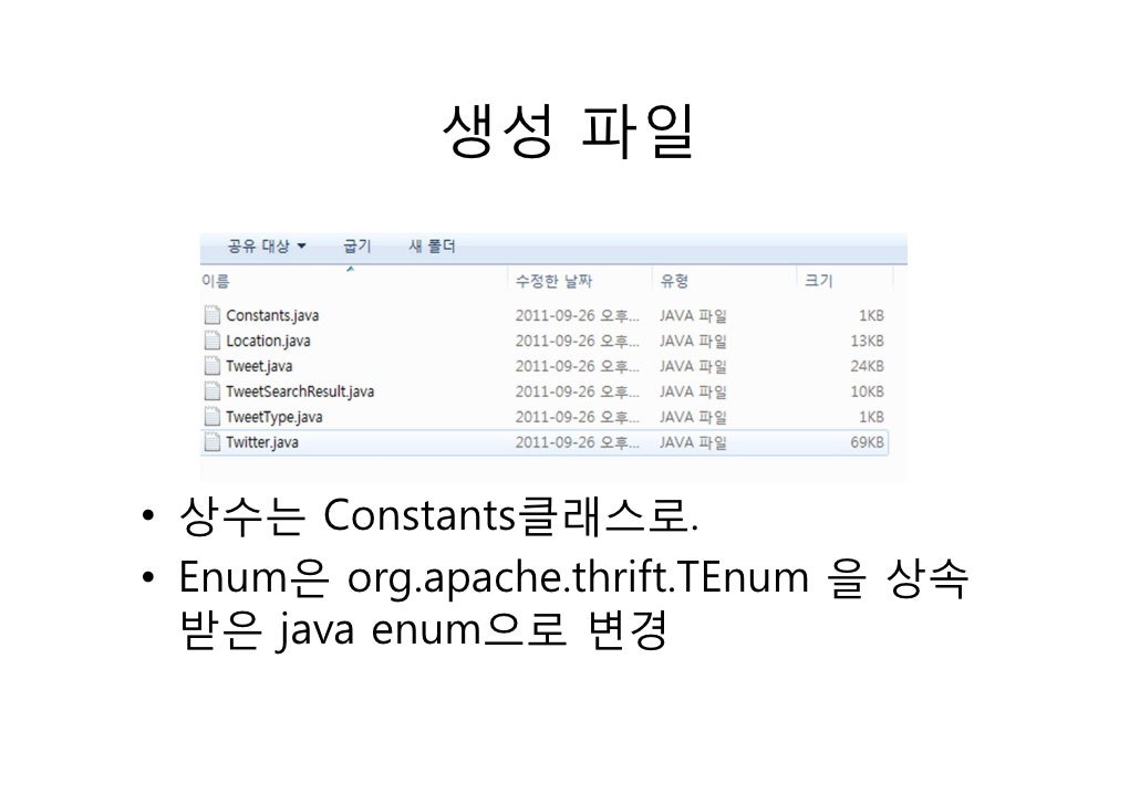 24. 24. 생성 파일• 상수는 Constants클래스로.• Enum은 org.apache.thrift.TEnum 을 상속 받은 java enum으로 변경