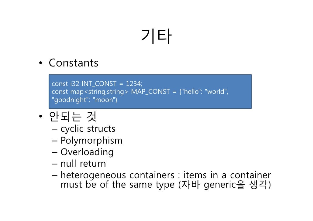 28. 28. 기타• Constants const i32 INT_CONST = 1234; const map<string,string> MAP_CONST = {"hello": "world", "goodnight": "moon"}• 안되는 것 – cyclic structs – Polymorphism – Overloading – null return – heterogeneous containers : items in a container must be of the same type (자바 generic을 생각)