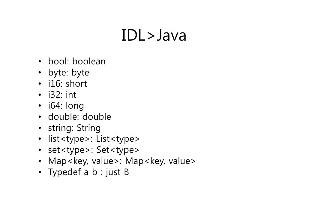 29. 29. IDL>Java• bool: boolean• byte: byte• i16: short• i32: int• i64: long• double: double• string: String• list<type>: List<type>• set<type>: Set<type>• Map<key, value>: Map<key, value>• Typedef a b : just B