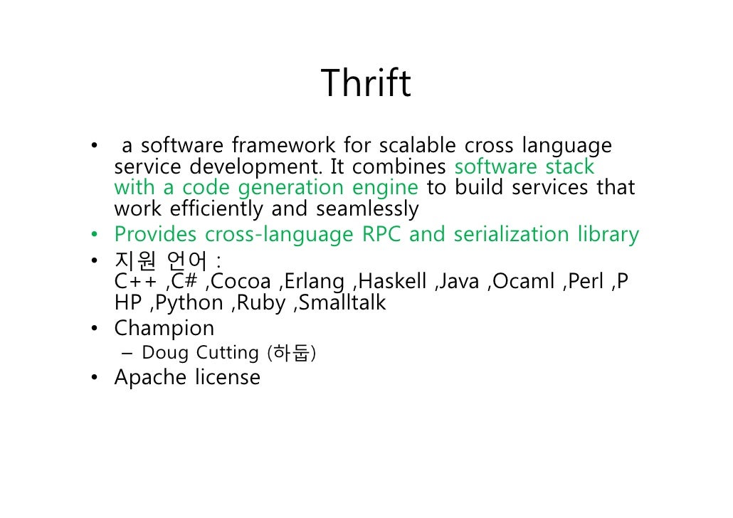 3. 3. Thrift• a software framework for scalable cross language service development. It combines software stack with a code generation engine to build services that work efficiently and seamlessly• Provides cross-language RPC and serialization library• 지원 언어 : C++ ,C# ,Cocoa ,Erlang ,Haskell ,Java ,Ocaml ,Perl ,P HP ,Python ,Ruby ,Smalltalk• Champion – Doug Cutting (하둡)• Apache license