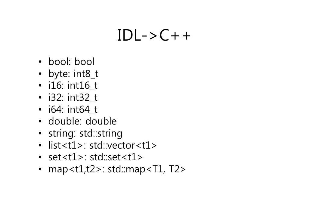 30. 30. IDL->C++• bool: bool• byte: int8_t• i16: int16_t• i32: int32_t• i64: int64_t• double: double• string: std::string• list<t1>: std::vector<t1>• set<t1>: std::set<t1>• map<t1,t2>: std::map<T1, T2>