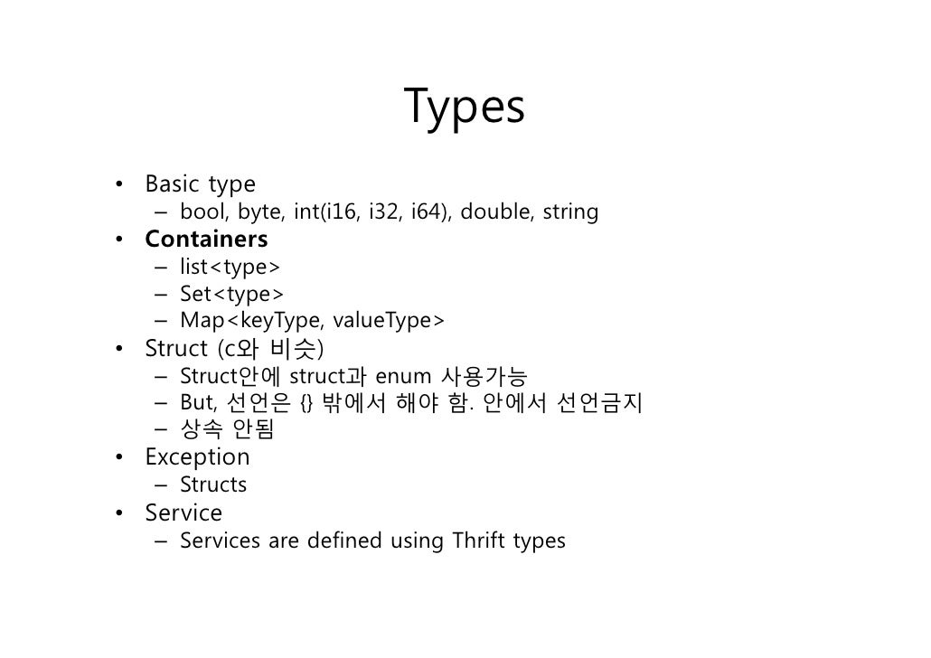 31. 31. Types• Basic type – bool, byte, int(i16, i32, i64), double, string• Containers – list<type> – Set<type> – Map<keyType, valueType>• Struct (c와 비슷) – Struct안에 struct과 enum 사용가능 – But, 선언은 {} 밖에서 해야 함. 안에서 선언금지 – 상속 안됨• Exception – Structs• Service – Services are defined using Thrift types
