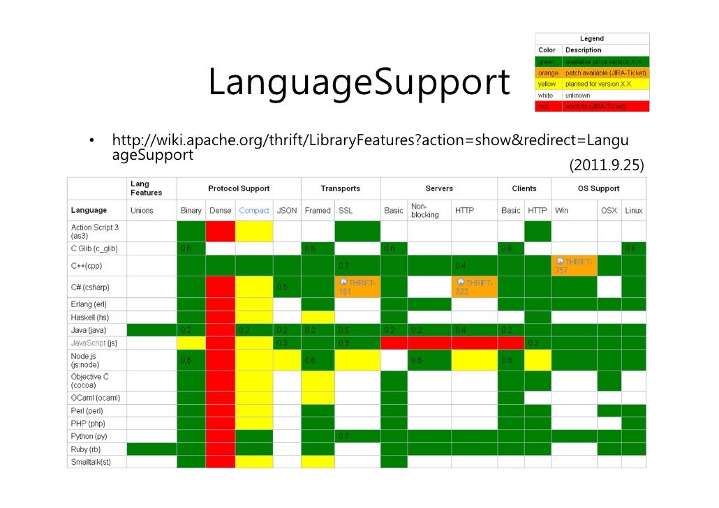 35. 35. LanguageSupport• http://wiki.apache.org/thrift/LibraryFeatures?action=show&redirect=Langu ageSupport (2011.9.25)