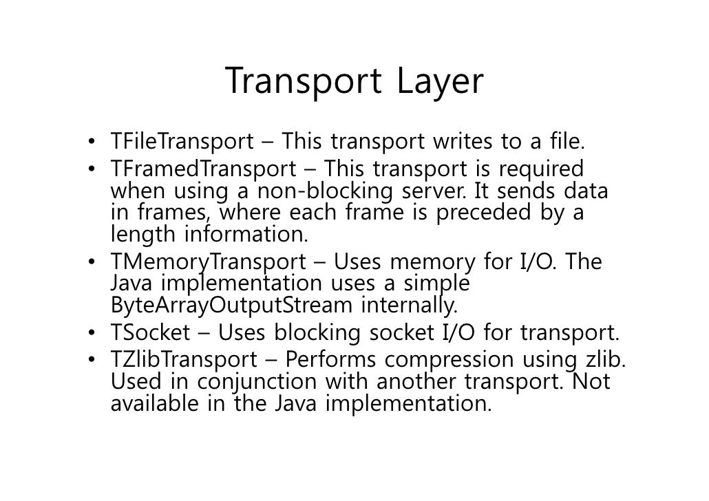37. 37. Transport Layer• TFileTransport – This transport writes to a file.• TFramedTransport – This transport is required when using a non-blocking server. It sends data in frames, where each frame is preceded by a length information.• TMemoryTransport – Uses memory for I/O. The Java implementation uses a simple ByteArrayOutputStream internally.• TSocket – Uses blocking socket I/O for transport.• TZlibTransport – Performs compression using zlib. Used in conjunction with another transport. Not available in the Java implementation.