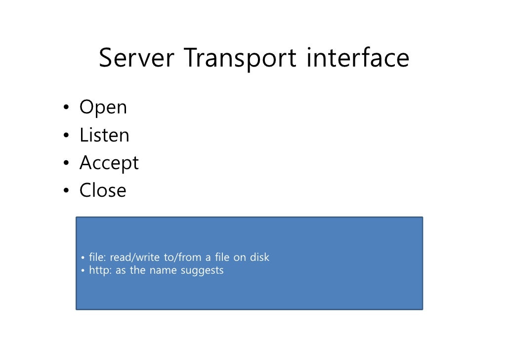 39. 39. Server Transport interface• Open• Listen• Accept• Close • file: read/write to/from a file on disk • http: as the name suggests