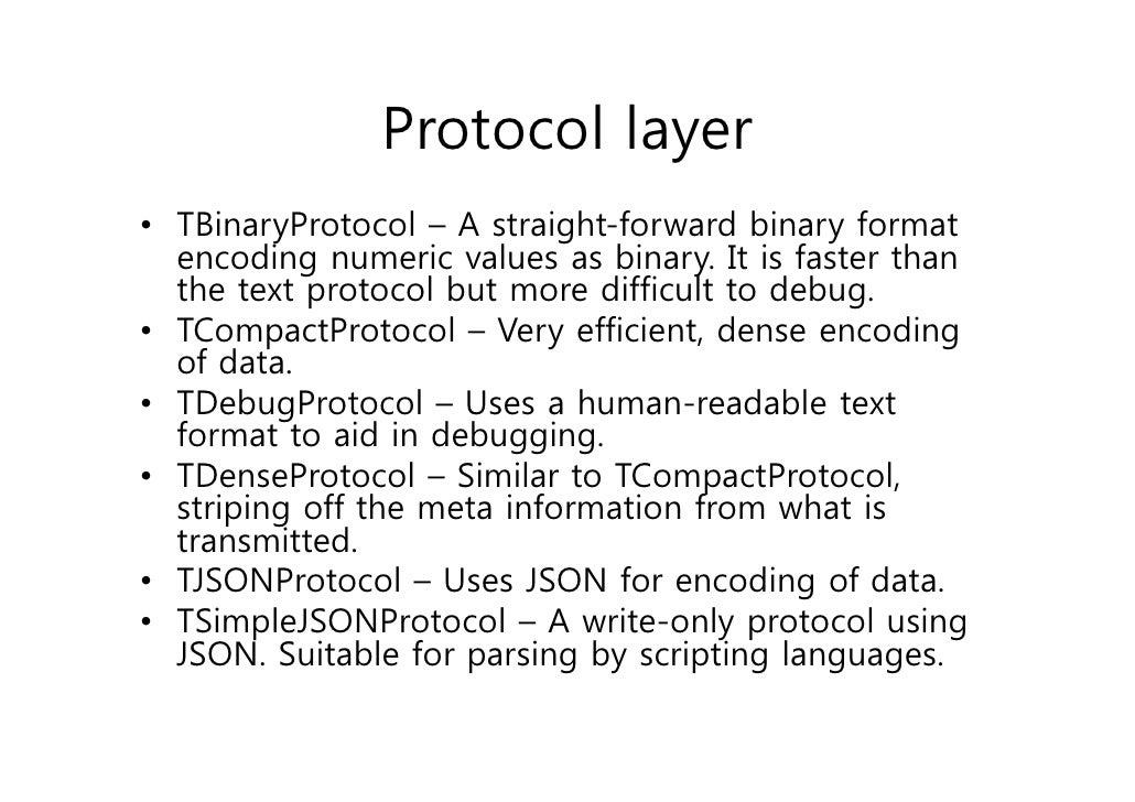 41. 41. Protocol layer• TBinaryProtocol – A straight-forward binary format encoding numeric values as binary. It is faster than the text protocol but more difficult to debug.• TCompactProtocol – Very efficient, dense encoding of data.• TDebugProtocol – Uses a human-readable text format to aid in debugging.• TDenseProtocol – Similar to TCompactProtocol, striping off the meta information from what is transmitted.• TJSONProtocol – Uses JSON for encoding of data.• TSimpleJSONProtocol – A write-only protocol using JSON. Suitable for parsing by scripting languages.