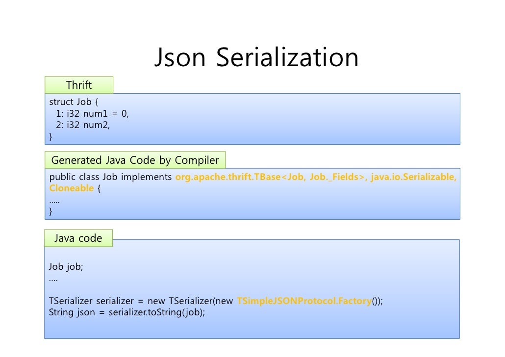 43. 43. Json Serialization Thriftstruct Job { 1: i32 num1 = 0, 2: i32 num2,}Generated Java Code by Compilerpublic class Job implements org.apache.thrift.TBase<Job, Job._Fields>, java.io.Serializable,Cloneable {.....} Java codeJob job;….TSerializer serializer = new TSerializer(new TSimpleJSONProtocol.Factory());String json = serializer.toString( job);