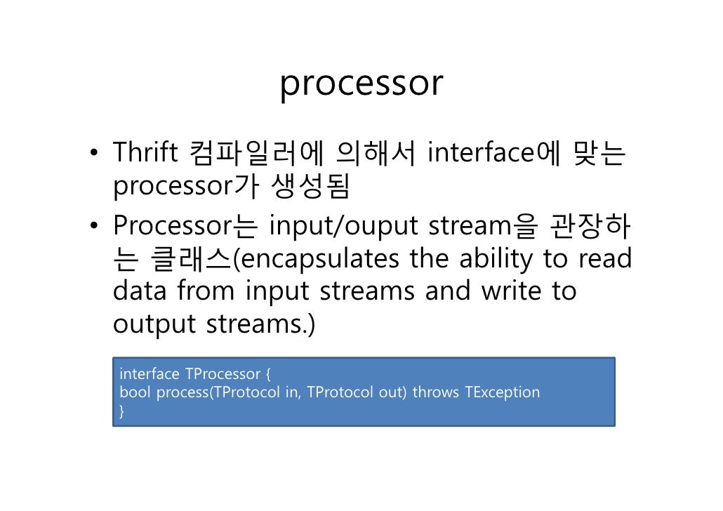 46. 46. processor• Thrift 컴파일러에 의해서 interface에 맞는 processor가 생성됨• Processor는 input/ouput stream을 관장하 는 클래스(encapsulates the ability to read data from input streams and write to output streams.) interface TProcessor { bool process(TProtocol in, TProtocol out) throws TException }